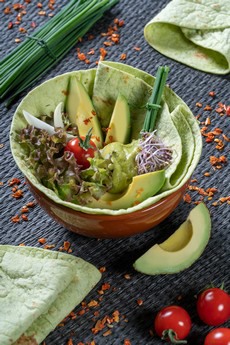 "These tortillas contain 20% Salud avocado pulp. The avocado's nutritional value, with its good fats, forms the basis of this tortilla. A single tortilla contains half the recommended daily allowance of Omega 3 and vitamin E. This product meets the modern consumers' needs. People are becoming more aware of the positive effects of eating avocados. This avocado tortilla is suitable for vegetarians, vegans, and diabetics."
