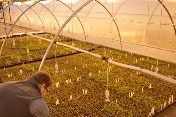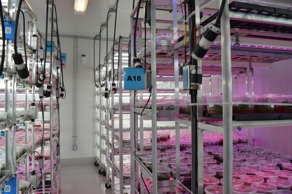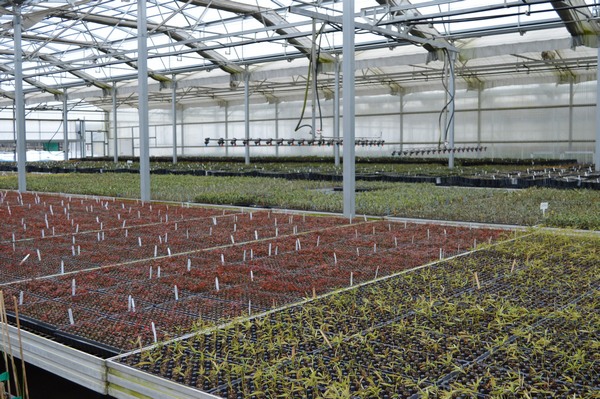 In the tissue culture lab, the plants grow in grow rooms, a controlled environment. Once they leave the grow room, the tissue culture plants need to acclimate four to five weeks in an environment with high humidity and a stable temperature. These conditions are being changed slowly to prepare the plants for outside conditions. From the acclimation area, the plants are taken out of media and put into trays that are placed under tunnels. At this point, the root formation process is being started and roots will gradually start to feed the plants.