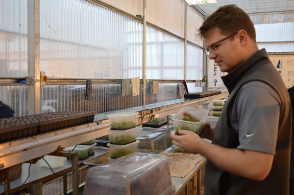 Tissue culture plants in the process of being moved from the grow room into small containers under tunnels.