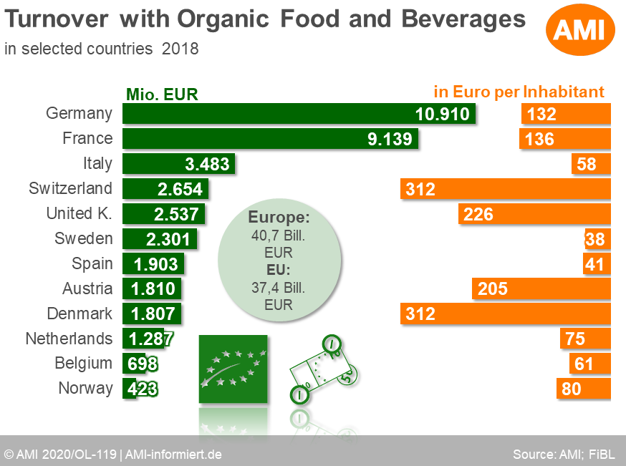Although Germany is the country that spends the most on organic food, countries such as Switzerland and Denmark lead the way when it comes to per-capita expenses.