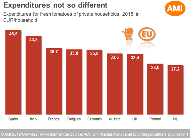 Although Spain, Italy and Poland are the leading tomato consumers in terms of per-capita volumes, the comparison on how much the different European countries spend does not show great differences.
