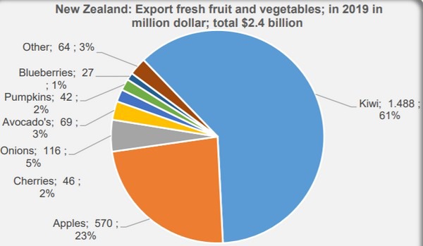 In 2019, New Zealand exported a record amount of fresh fruit and vegetables - a total of 1,38 million tons. That is five percent more than in 2018. It is also even a little more than in their record 2016 year. In 2019, these exports represented a value of NZ$ 2,4 billion. The kiwi is, by far, the most important product. In quantities, this fruit represents a share of 44%.