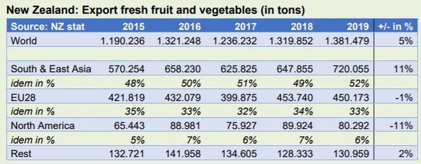 It is, however, somewhat unclear how much the separate countries represent. The New Zealand Bureau of Statistics specifies that some export products go to the EU. They do not say to which countries, specifically. This does, however, mainly concern exports to Belgium. Last year, New Zealand sent about 200,000 tons of fresh goods to Japan. This volume is the same as in 2018.