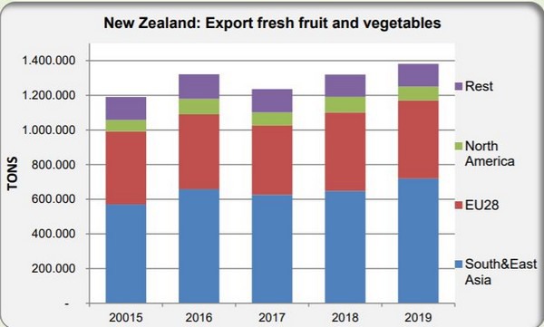 More than half of the fresh fruit and vegetable exports from New Zealand go to countries in southern and eastern Asia. In recent years, this region's share has done nothing but climb. Last year's totals amounted to 720,000 tons, 11% higher than in 2018. The European Union is New Zealand's second-largest sales area. Exports to this region, however, dropped slightly. Together, these regions represent 85% of the total amount of fresh fruit and vegetables exported from New Zealand.
