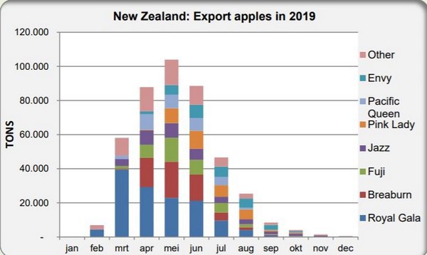 Royal Gala apples are New Zealand's most important export apple variety. With 132,000 tons, a record quantity of this product was exported last year. Sales of Royal Galas to the Netherlands, in particular, went well in 2019. Braeburn exports decreased after 2018's growth. This concerns mostly sales to EU countries.