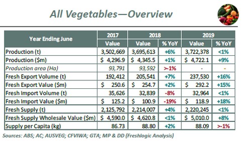 The entire fruit category had an increase in production of just one per cent, but the value increased by nine per cent to $5.5billion. It was a similar story in the vegetable category, with a volume increase of less than one per cent, but a jump in value by nine per cent to $4.7billion.