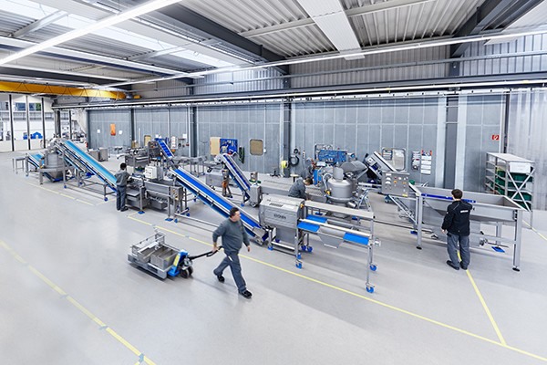 The processing line will significantly increase the degree of automation and flexibility in Coto´s production as the operation of the line requires very few employees and the different modules of the line cover various processing steps and can be operated separately. The processing line consists of: a potato water bunker belt, two PL 40K peeling machines, a roller sorting table, a conveyor belt, a KUJ V cube, strip and slice cutting machine, a GS 10-2 belt cutting machine with a trimming table on one side and a conveyor belt at the other, a GEWA 2600V ECO washing machine which leads to a K650 drying system and ultimately to a GKS packaging system including an UP 500 packaging machine integrated in a gantry with a multi-head weighing system.
