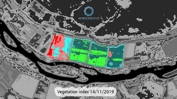 2 weeks after the frost event. The red in picture indicates complete loss of produce. We were able to protect 20ha of table grapes under 2 x 30kw AGI Frost Fans