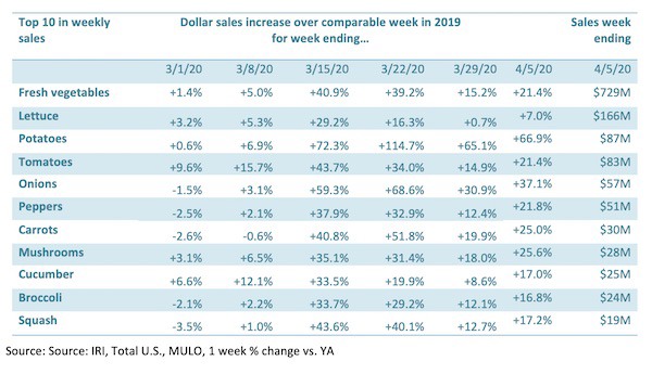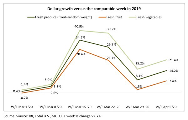 Consumers continued to split their produce dollar three ways during the week of April 5. Frozen and canned vegetables had ongoing strong growth during the first week of April and have been leading sales growth since the onset of coronavirus during the early weeks of March.