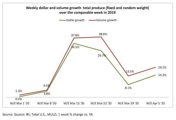 At the onset of coronavirus in the U.S., dollar and volume sales were close together for total produce, at +0.4% for dollars and +1.3% in volume. Starting with the week ending March 22, volume sales far exceeded dollar sales, which would indicate deflation setting in at retail for some areas. For the week of April 5, volume increases exceeded dollars by nearly five percentage points.