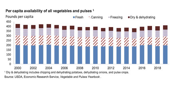 In 2019, total U.S. per capita vegetable use (availability) increased 2 percent to 409 pounds. Except for pulse crops, all major categories exhibited increases. Recovering from a 6 percent drop in 2018, fresh-market vegetable availability (including potatoes) rose 4 percent to 198 pounds in 2019. In fact, 16 of the top 25 fresh-market vegetables posted gains in availability driven largely by increases for spinach, cauliflower, cabbage, carrots, green beans, and potatoes.