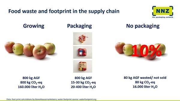 The production of this packaging is associated with CO2 emissions of 15 to 30kg and water usage of between 20 and 400 liters. “Suppose that, with unpackaged apples, a ten percent wastage has to be considered. That equates to 80kg of apples that are lost or unsold because they were not sufficiently protected. In that case, 80 kg of CO2 and 16,000 liters of water is wasted. That, while the packaging’s environmental impact is only a fraction of that.”