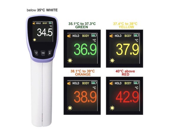 The HT20 thermometer features counts on color led display, audible fever alarm, and color indicator of temperature. The colored LED display is incredibly useful for quick fever detection with five color zones for stand-by, normal, caution, high, and severe temperatures. Users can utilize modes to select human body or objects and display minimum, maximum, and average values. Temperature measurements range 32.0°C to 42.9°C (89.6°F to 109.2°F).