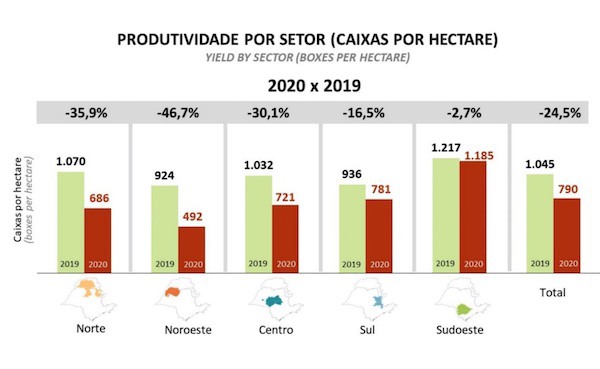 Yield per sector this crop season, as compared to last year’s, shows significant variations among locations. The Northwest sector, encompassing the regions of Votuporanga and São José do Rio Preto, ranks first in yield drop. 492 boxes per hectare expected to be produced in that sector represent a drop of 46.7% in relation to the 2019-2020 crop. Next comes the North sector (regions of Triângulo Mineiro, Bebedouro and Altinópolis), with an expected yield of 686 boxes per hectare (-35.9%); then the Central sector (regions of Matão, Duartina and Brotas), with 721 boxes expected per hectare (-30.1%); the South sector (regions of Porto Ferreira and Limeira), with 781 boxes expected per hectare (-16.5%); and the Southwest (regions of Avaré and Itapetininga), where 1.185 boxes should be harvested per hectare (-2.7%).