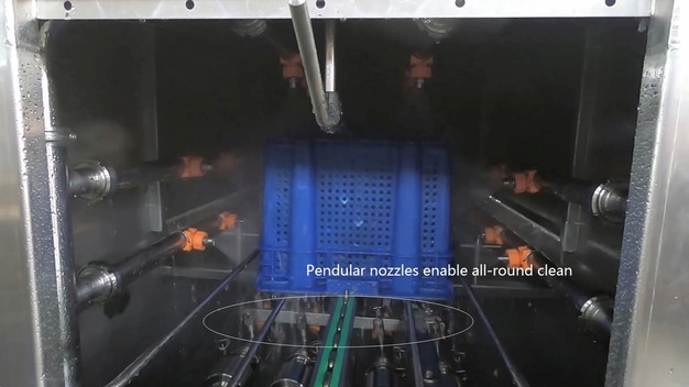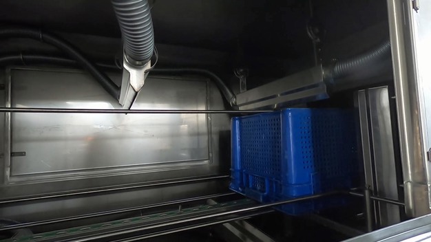 After washing, the conveyor will deliver baskets to the drying process. This basket washer can be connected with a basket stacker to achieve full automation. “This machine is an economical choice. It helps processing factories save a huge amount of water and labor cost. “