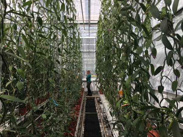 Greenhouse cultivation, Wouter explains, could provide the necessary market stabilization here. And the crop can be grown in the greenhouse. It takes a pretty conventional high-wire cucumber cultivation system to yield excellent quality vanilla, on par with what you'd get from nature.
