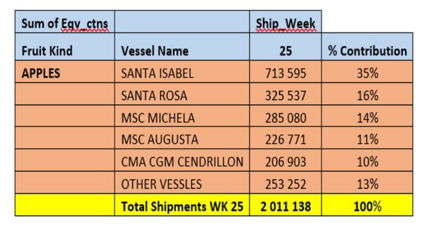 However, an above-average volume of pome fruit left our shores in week 25. The table below indicates all the major vessels that sailed in week 25 contributing to the spike. The Santa Isabel with 713 595 eqv. cartons (35%) on board was the vessel with the most apples shipped, followed by the Santa Rosa with 325 565 cartons (16%) and the MSC Michela with 285 080 cartons (14%).
