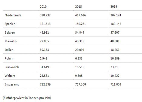 According to the Federal Statistical Office, the annual harvest of tomatoes in Germany has increased from about 73,300 to almost 107,000 tonnes since 2010. Nevertheless, most tomatoes come from neighbouring countries. Almost 80 percent of total imports in 2019 came from the Netherlands and Spain. While imports from Italy and France have more than halved, imports from Poland are increasing: