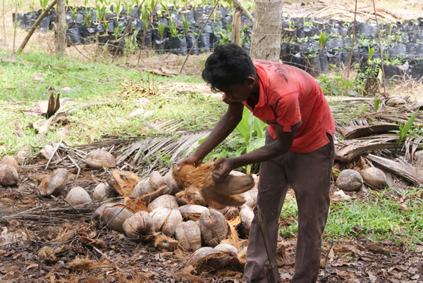 "We get our coconuts from only the Ivory Coast, Sri Lanka, and the Dominican Republic. They are harvested by people using long poles. Harvesting is done entirely by hand in these countries."