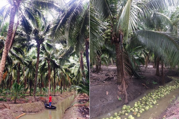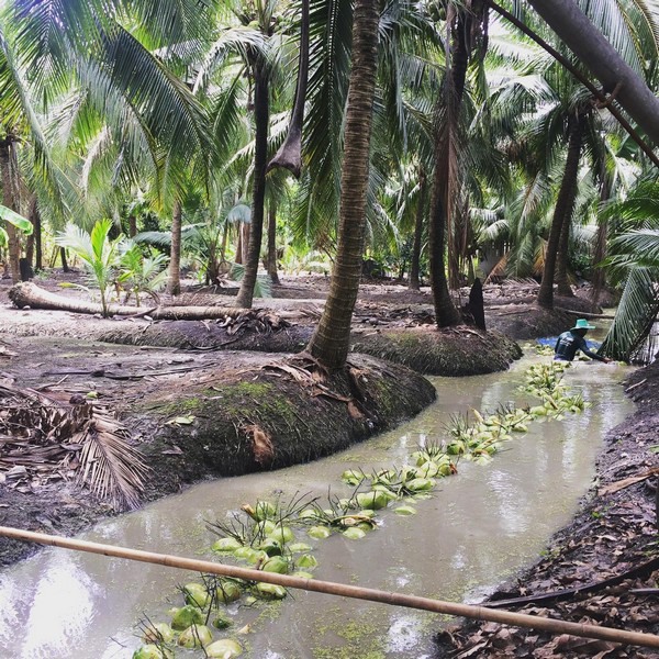 Young coconuts being harvested on one of the farms Explosive Foods works with. The coconuts are harvested by people using long poles.