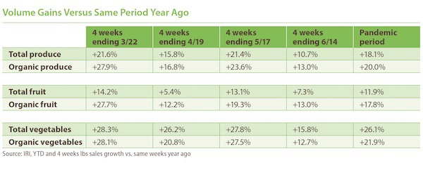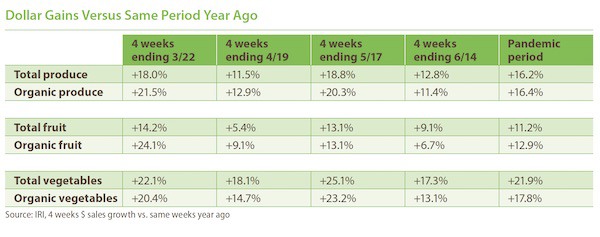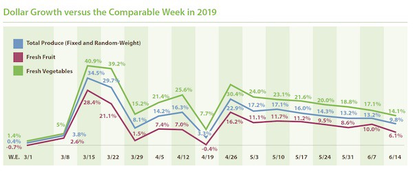 As organic sales make up less than 10% of total produce sales, the percentage increases for organic fruit and vegetables are somewhat higher. While the percentages tell one story, absolute dollar gains tell another. Year-to-date through June 14, the produce department has sold an additional $3.0 billion in fresh produce versus the same period in 2019. Organic produce has sold an additional $269.3 million during this same time period.