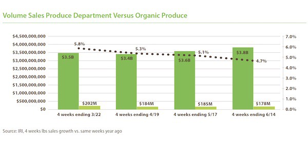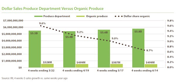 During the first four-week period ending March 22, organic produce sales were just shy of $528 million. Total produce department sales were just over $5.5 billion. This translates into a 9.6% share for organic produce during that first four-week period. As conventional benefitted from robust sales gains off the $5.5 billion base throughout the pandemic, the share of organic produce versus the total department has actually dropped somewhat despite higher-than-average growth percentages during three out of the four periods. During the most recent four week period ending June 14, the dollar share for organic produce is down to 8.7%.
