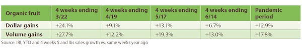 Organic fruit experienced stronger volume than dollar gains throughout the pandemic, which signals deflationary pressure. Moreover, the volume/dollar gap is growing wider, at 6.3 percentage points during the June time period.