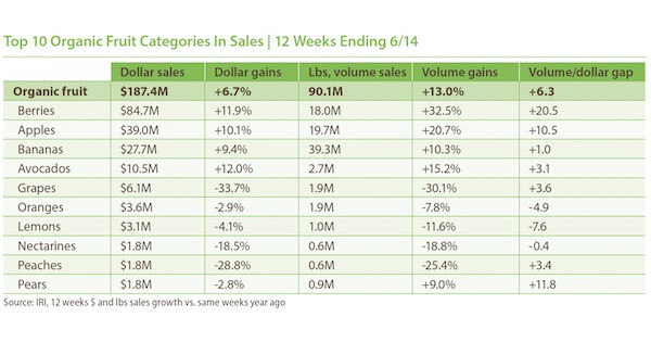 Berries were easily the top organic fruit seller during the pandemic, generating $85 million in sales during the four weeks ending June 14 versus the same period year ago. However, they also had the highest volume/dollar gap with an increase of +11.9% in dollars and 32.5% in pounds. Apples and bananas close out the top three.