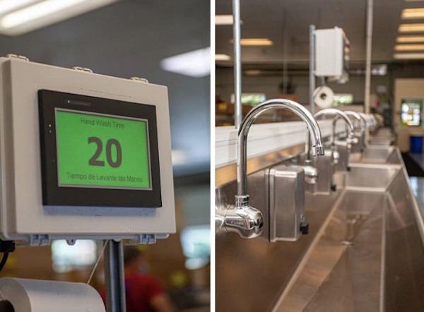Getting apples ready for the retail shelf requires a tremendous amount of human input, and every step was made more complex by the COVID-19 pandemic. All onsite employees either self-report online or complete a health questionnaire before entering for their shift. Forklift drivers now have assigned equipment. The shipping and receiving office has plexiglass barriers. At least six feet separates work stations in the packinghouse. Workers have staggered arrival, departure, and break timing. They wear masks and other company-provided protective equipment. Common touch areas are sanitized regularly. Hand sanitizer dispensers were placed throughout the facility, and additional wash stations were installed to prevent crowding and improve hand washing processes.