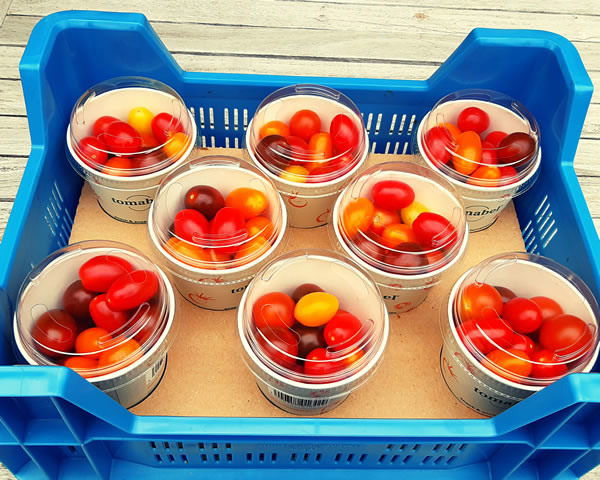 Right: Tomabel vine tomatoes in the new cardboard packaging (available year-round)