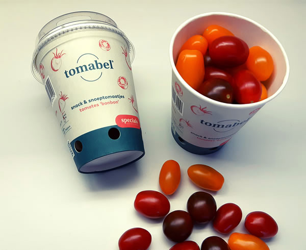 The REO Veiling is offering its Tomabel snack and snack tomatoes in new Tomabel shakers from today (Wednesday 2 September). This stylish cardboard packaging with transparent lid replaces the black 'Nova' punnets and offers three customer-friendly advantages: the product is highly visible in the small packaging, the product is easy to take with you as a healthy snack and the packaging is easy to sort.