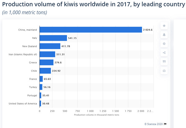 It's no surprise that China cultivates a lot of kiwis. That country grows a considerable volume of 2 million tons. Italy and New Zealand are also decent global players on the kiwi market. Farmers there grow 541,000 tons and 411,000 tons respectively. However, according to Statista.com, Iran cultivates 311,000 tons of kiwis. That makes it the fourth largest kiwi producing country in the world.