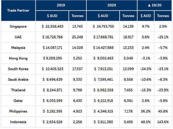 The United Arab Emirates (UAE) rose 5.6 per cent in value but experienced a decline of 25 per cent in volume. Malaysia saw a similar trend, with a rise in export value of 2.4 per cent and a decline of 5.7 per cent in volume. South Korea experienced the largest decline in trade of the top export markets, with an average drop of 24 per cent in both value and volume.