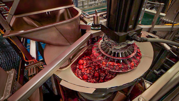 To create the juice for POM Wonderful, pomegranates are harvested and transported to the processing facility, and conveyed to a mechanical press where they are crushed, leaving behind a husk made up of rind, pith, and seeds. The juice is extracted and sent to be bottled while the husks are discharged.