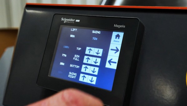 The robotic bin filler has an easy to use intuitive touch screen where smart features are setup like variable fruit flow, variable flap rotation, pre-set filling upper and lower limits and bin change-over clearance heights and positions.