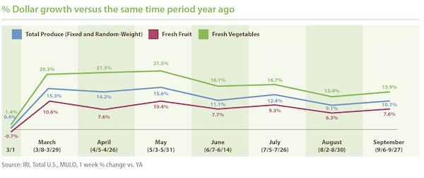 The strong produce volume performance was driven by fruit, that saw a 12.6% increase in September versus the same month year ago — up from +3.7% the month prior. Vegetables had strong volume gains as well, but they tracked four points below dollar gains.