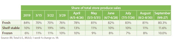 Fresh produce commanded an 80.3% share of total fruit and vegetable sales across all three temperature zones during the four September weeks — down a percentage point from its August average of 81.3%. It is also the lowest share since April. “It is important to point out that inflationary levels in frozen and canned goods have been higher than those in fresh produce, which impacts dollar shares,” said Jonna Parker, Team Lead for Fresh at IRI. “However, the pandemic has definitely fueled a consumer desire for items with longer shelf-life, whether that is hardier fresh fruits and vegetables or diverting dollars to canned and frozen.”