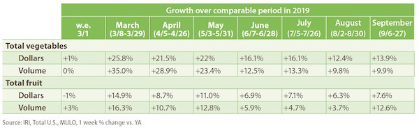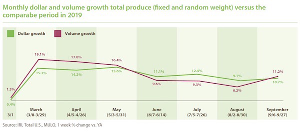 Fresh produce generated $5.04 billion in sales during the four September weeks — an additional $489 million in sales versus the same time period in 2019. This encompasses an additional $171 million in additional fruit sales and $313 million in additional vegetable sales. Vegetable sales have outpaced fruit sales throughout the pandemic and have generated 28 weeks of double-digit growth since the onset of the pandemic shopping patterns in mid-March.