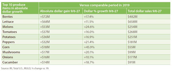 “The strength of vegetables amid the pandemic is clearly demonstrated by the top 10 in absolute dollar gains,” said Watson. “While berries and melons had very strong September performance as the numbers one and three in absolute dollar gains versus year ago, the remaining eight top 10 contenders were all vegetables.”