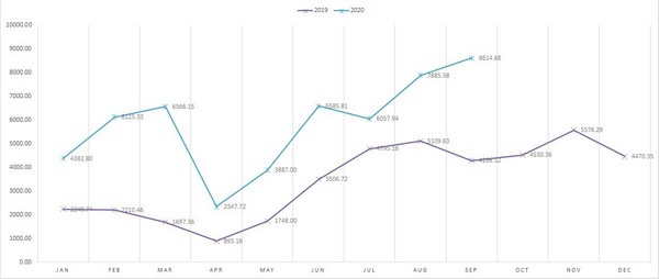 Peruvian ginger export figures (per $ 1,000). Purple line is the figures for 2019; blue line, 2020.