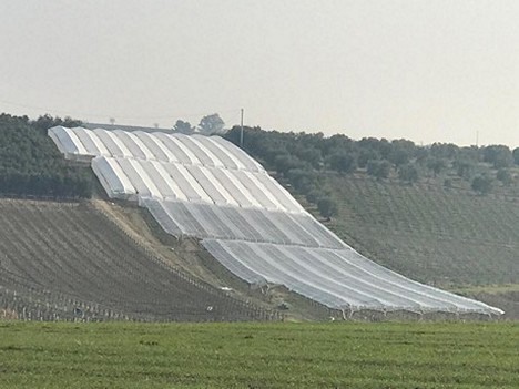 "Nuovo-PoliTex, instead, is a plastic-coated tarpaulin that generates jagged diffused light, often used to extend the harvesting period, thanks to its excellent refreshing power. If installed before veraison, it allows to obtain a ripening extension of about 10 days, so as to stagger the harvest and not flood the market. The Nuovo-PoliTex stands out for its mechanical strength, which makes it remarkably resistant to tears and for the excellent passage of UV rays."