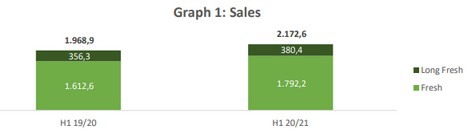 • Long Fresh. Sales have increased by €24,1 m (6,8%) in the first half of the financial year, up from €356,3m to €380,4m. Despite the temporary drop in sales to food service customers, when out-of-home consumption ground to a halt in the second quarter of the calendar year, particularly affecting the Frozen division. The Long Fresh segment continues its steady growth. The sales dip in the food service segment has been offset by increased sales to retail customers.