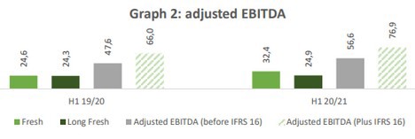 • Long Fresh. The adjusted EBITDA for the Long Fresh segment increased by 2,5%, up from €24,3 m to €24,9 m, mainly driven by a better product/price mix. Nevertheless, the margin declined slightly by 27bps due to costs associated with COVID-19 and lower than expected agricultural yields over the summer, though yields gradually recovered from September onwards.