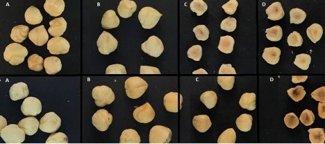 Hazelnuts roasted at 130°C (a), 150°C (b), 160°C (c) and 170°C (d) for 15 min and 30 min in above and below row, respectively.
