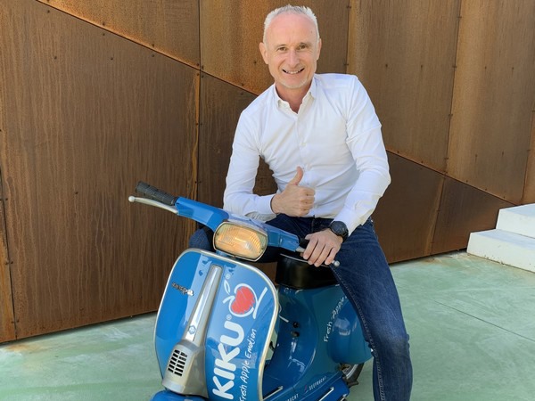 Jürgen Braun on the branded Vespa received as a gift from German partner Salemfrucht/Seefrucht for KIKU's anniversary