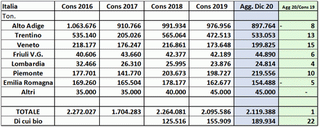 Alto Adige lost some ground, with some areas affected by spring frosts and hailstorms, while Trentino regained the levels of previous years. There was also an increase in production in Veneto and Lombardy. Emilia-Romagna's production dropped, also due to adverse weather conditions, while Piedmont's production set a record, now the second most important after Trentino-Alto Adige.