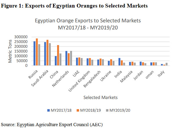 Saudi Arabia, Russia, the Netherlands, China, and the United Arab Emirates are likely to remain the main export destinations for oranges from Egypt. Recent new export destinations for these oranges include New Zealand, Japan, and Brazil. In 2019/2020, Egyptian orange exports decreased by 343.000 tonnes compared to the previous season. The COVID-19 pandemic is the main reason for this.