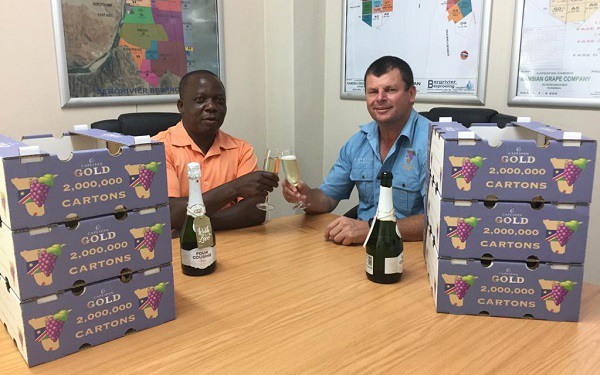 Capespan Namibia directors Gideon Nuunyango and Kobus Bothma toasting their best ever Namibian grape season (photos supplied by Capespan Namibia)