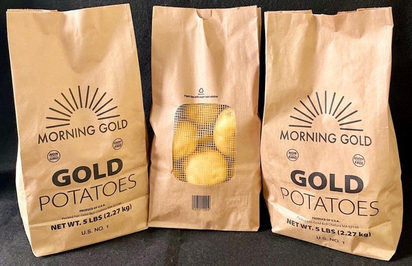 The new potato packaging bags are made of two-ply paper with compostable glue used around the window of the bag. Made from sugar cane, the mesh window itself is also compostable. Morning Kiss Organic will offer organic gold, russet and red potatoes in the new packaging. Gold Bell will offer conventional gold and russet potatoes under the Morning Gold brand name.
