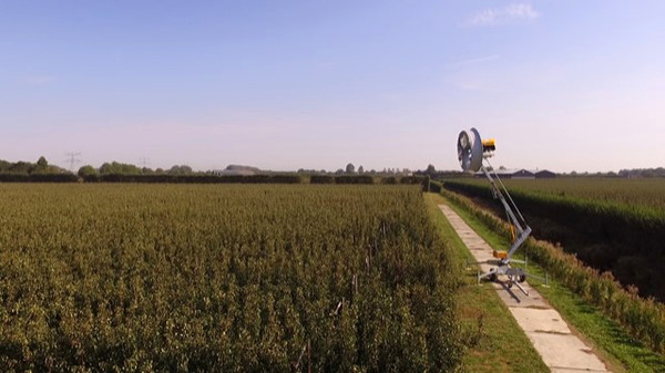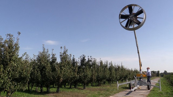 "Its propeller is directly driven. A relatively small motor (23.7 pk-diesel) is, therefore, more than enough to create tremendous airflow. It can protect up to 4.5 hectares. The machine can smoothly rotate or pivot between zero and 360 degrees. You can set its rotation speed too. You must position the machine correctly to get good protection."